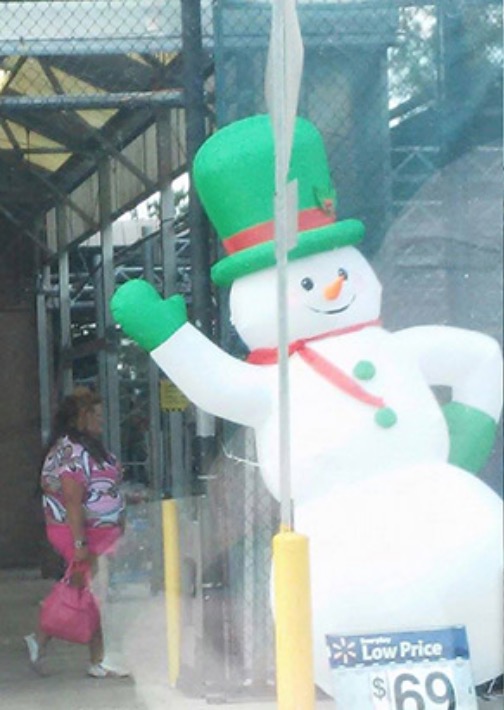 Looks like Frosty is trying to rough up shoppers at Walmart. Unfortunately the 10 foot frosty is no match for this woman. She must be related to heat miser!