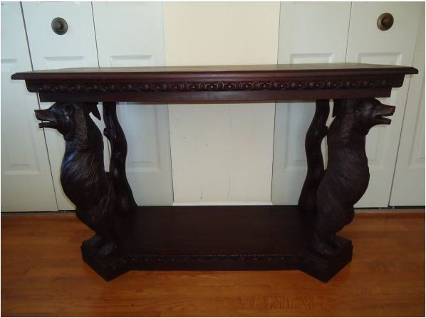 Beautiful, hand carved German Black Forest walnut sofa table.