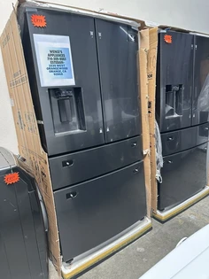 this a sleek, modern Samsung four-door refrigerator with a black stainless steel finish. It features a built-in water and ice dispenser on the front of the upper right door. The design includes two upper French doors and two lower drawers, providing ample