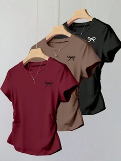 These cute short-sleeve tees come in three fresh colors – rich maroon, warm brown, and sleek black – each with a stylish black (or white on black) bow embroidered on the left chest. The round-neck fit is comfy and trendy, perfect for everyday wear or a ca