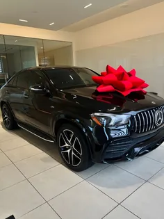 This is a sleek and powerful black Mercedes-Benz SUV, presented indoors with a striking red gift bow on the hood, giving it a celebratory and luxurious feel. The vehicle features a bold front grille with vertical slats, signature LED headlights, and sport