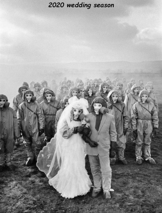 Nothing like the bride and groom in gas masks. It looks like a seen from World War II.