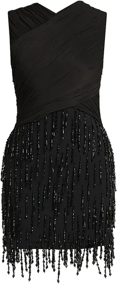 Crafted of an Italian stretch wool blend, Alberta Feretti's sleek minidress elevated the bodice with a gathered, wrapped silhouette. This piece features drop bead embellishments at the pencil skirt creating extra shine and movement.