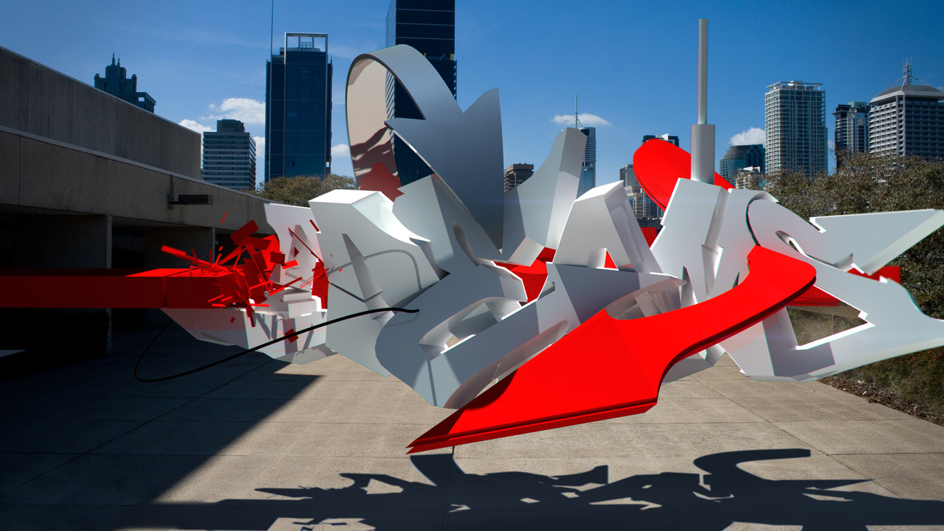 3D Graffiti in the city. Great computer analyzed 3D art with the city in the background. The shadow makes it actually look realistic.