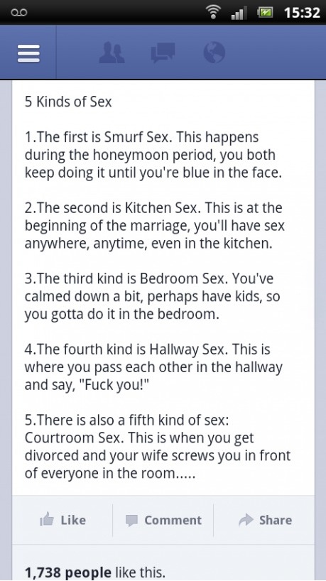 1. The first is Smurf sex. This happens during the honeymoon period, you both keep doing it until you're blue in the face. 2. The second is Kitchen Sex. This is at the beginning of the marriage, you'll have sex anywhere, anytime even in the kitchen. 3. The third kind is Bedroom Sex. You've calmed down a bit, perhaps have kids, so you gotta do it in the bedroom. 4. The fourth kind is hallway sex. This is where you pass each other in the hallway and say "Fuck You!" 5. There is also a fifth kind of sex: courtroom sex. This is when you get divorced and your wife screws you in front of everyone in the room....