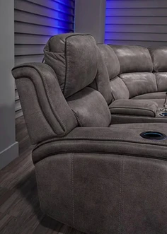 Material:Microfiber looks like leather. With dual power recliners with power head rests, USB charging ports, ambient lights, cup holders, and storage bin.