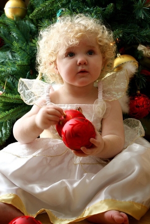 This little cutie is ready for Christmas. Ornaments in hand and holiday dress on. Perfect.