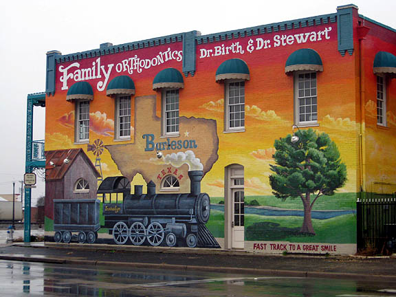 This is one of several custom painted murals in Burleson, Texas. It is on the side of a family orthodontist office. It is bright and colorful and fun for kids.