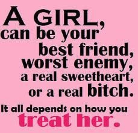 A girl, can be your best friend, worst enemy, a real sweetheart, or a real BITCH.