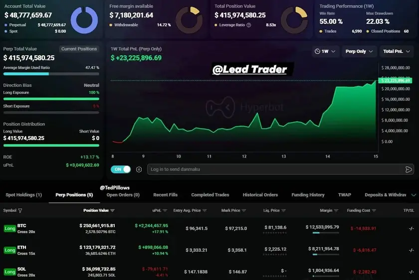 A whale has opened long positions here. Current Positions: ▫️ $250,000,000 $BTC long ▫️ $123,000,000 $ETH long ▫️ $36,000,000 $SOL long In the past week alone, this whale has made $23,225,000 in profits.