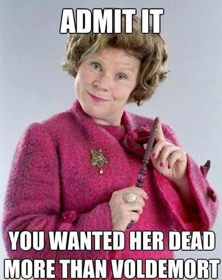 Umbridge has got to be one of the most irritating book characters in the history of pop fiction tales. She makes Voldemort seem almost tolerable as a character. JK Rowling really did a number with this one.