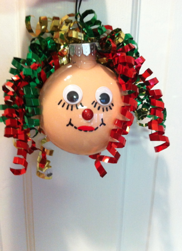 Glue on eyes and nose. Draw on eyelashes, mouth and lips. Allow to dry. Cut different lengths of curly Christmas ribbon and attach to the removable top of the ornament where the hook is placed.