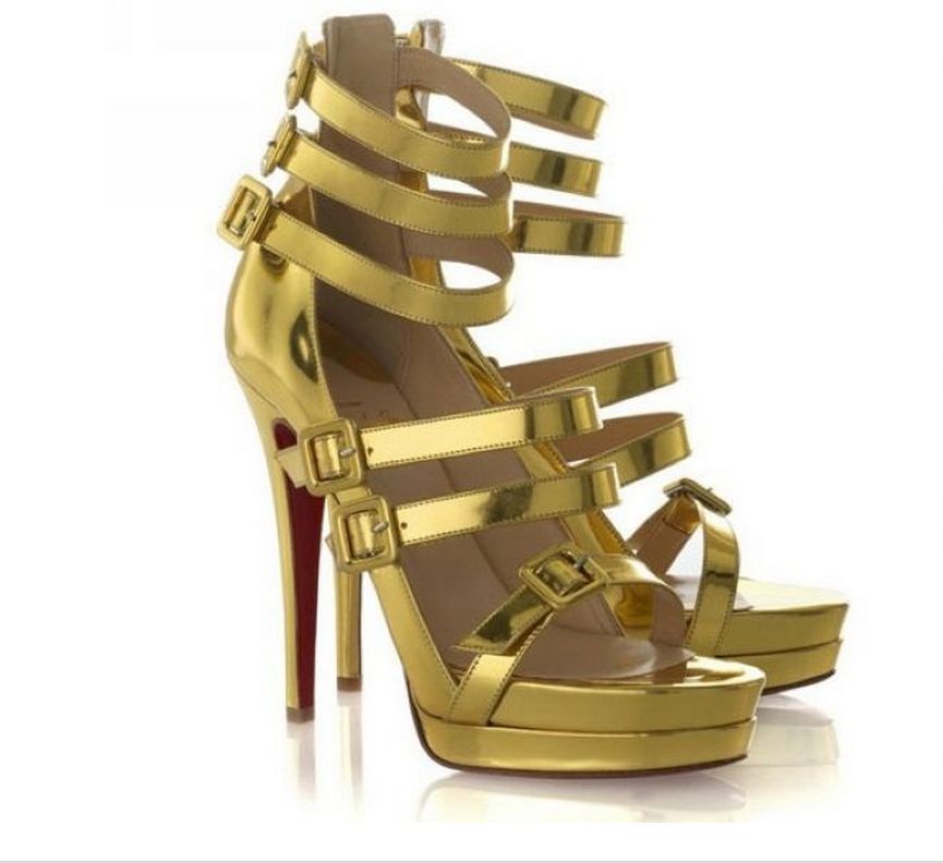 Design patent real leather red-sole buckled high heel sandals evening party booties club pub shoes pumps golden black