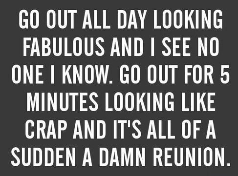 Go out all day looking fabulous and I see no one I know. Go out for five minutes looking like crap and it's all of a sudden a damn reunion.