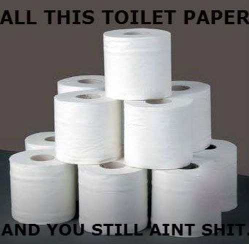 All this toilet paper and you still ain't shit or maybe you are just constipated? Take your pick. Reminds me of being out on the ocean all this water not a drop to drink.