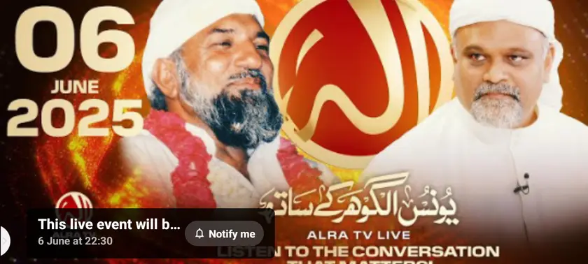 ALRA TV Live with Younus AlGohar 6 june 2025 sayyadi Younus AlGohar live YouTube channel india time 3.00 am https://www.youtube.com/live/WlL6iMQwju0?si=CP_qCKwuxIY-_Hfu