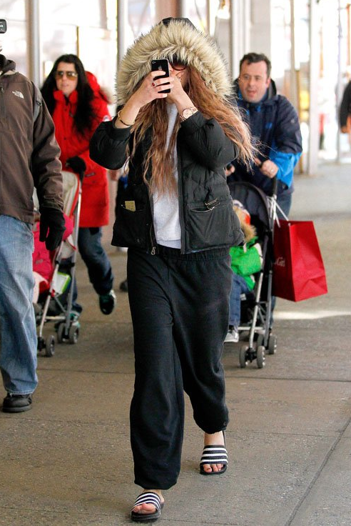 Donning a low key pair of black sweats and a fur lined hooded jacket, the "What I Like About You" actress ran her errands, all the while keeping her hand to her mouth and her cell phone held up to eye level, much to the puzzlement of passers by.