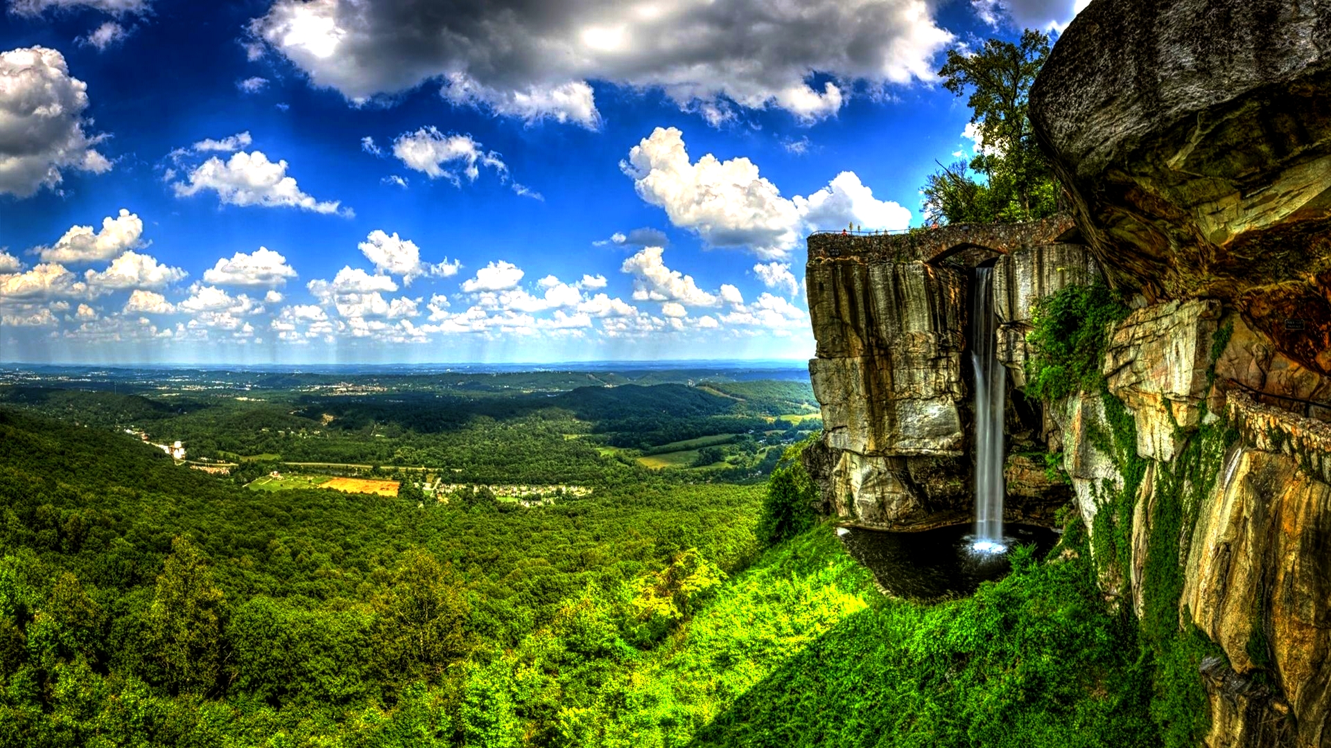 This picture was taken off a cliff. Capturing this amazing view of the side of the cliff with the beautiful waterfall flowing off of it, and then with the hilly land and the bright blue sky, this view is just amazing.