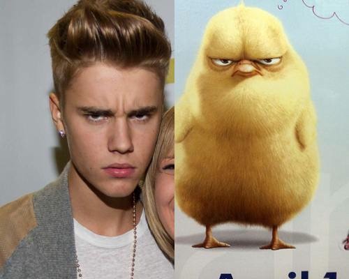 Justin Bieber is a doppelganger for this angry baby yellow chicken! The chick has the same eyebrows and forehead and look at their faces! Dead ringers. Is the Biebs a bird?