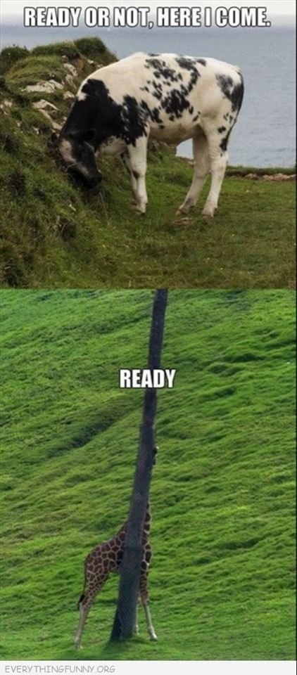 The giraffe and the cow decide to play a game of hide and seek. I don't think the cow will have too many problems finding that giraffe. It's not a very good hiding place.