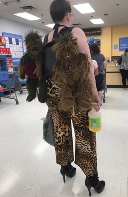 If you are in the market for some stuff Wookies like Chewbacca or you are looking for Bigfoot you'll find a wide assortment of stuffed animals at Walmart. Be sure to dress like an animal in high heel stilettos.
