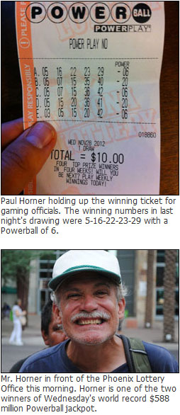 The second winner of the Powerball lottery is Paul Horner from Arizona. Mr. Horner is a homeless man. Just the night before he was sleeping on a park bench and begging for change. He had lost his job and his wife had left him taking his kids to Wyoming. After winning, he said all he wants is for his wife to take him back and to see his kids. He picked his numbers as follows..Youngest son is 5, daughter is 16, He married at 22 and his wife 23, and the 29th is the date he planned to win the lottery...and the number 6 is the number of kids he and his wife had planned on having before she left him.