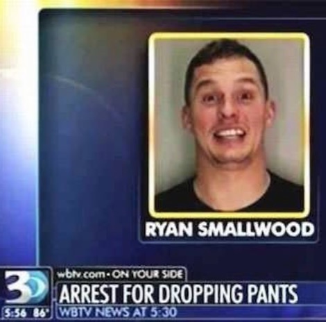 Breaking news. Ryan Smallwood has been arrested for dropping pants. Surprisingly he didn't much to show for himself and has been hampered by a bad last name.