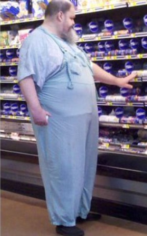 Walmart is like the forest gump of shopping. You never know what you are going to get. This guy in scrubs either cam straight from surgery or he found his clothes in the dumpster.