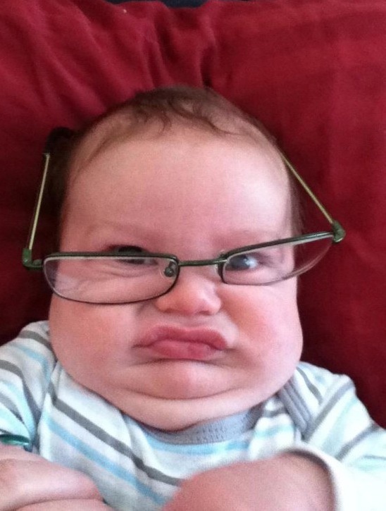This little guy looks like he's studying hard with those glasses. Not much to do at that age except observe, poop, eat, and sleep.