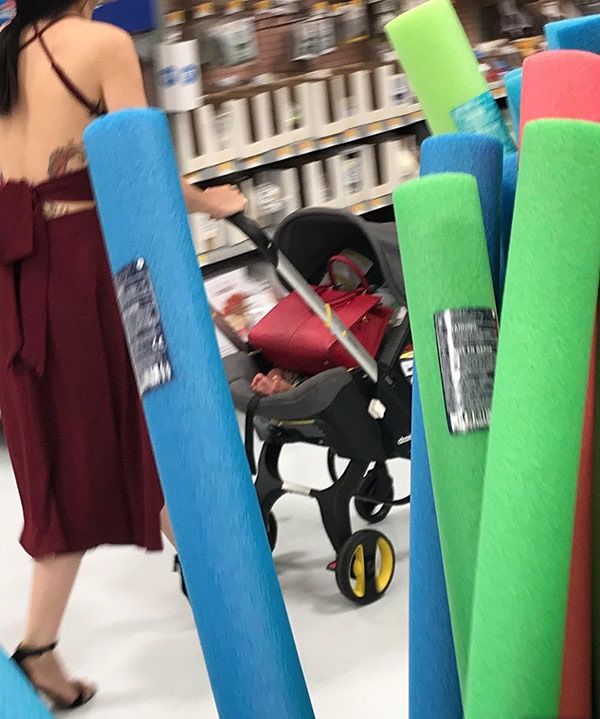 Nice of her baby carriage to carry her purse. Hopefully the baby can still breathe.
