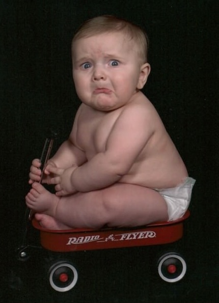 This little guy in diapers has the biggest frown on his face. I think he is not too fond of his radio flyer wagon. What do you think?