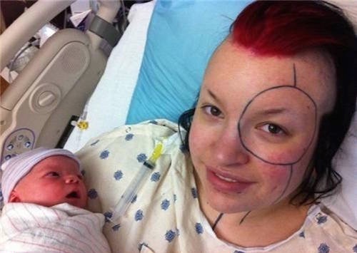 I can't tell if her tattoo is a stick figure or a big giant magnifying glass. All I know is this baby is going to be scarred for life. I can't stop staring at my mom's eye.