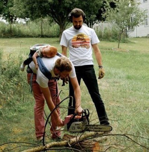 Talk about parents that are too cautious with their kids? How about these two prize winners. Maybe it's just a little unsafe to be carrying your kid next to a chainsaw unless you don't mind him in pieces.