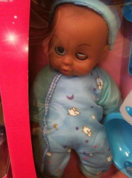 baby doll at walmart with one of its eye poked out. wtf guy that work at walmart will this sell.