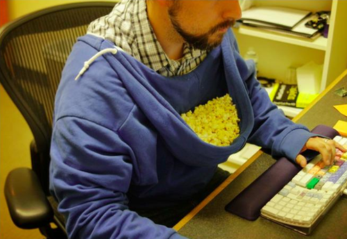 Perfect way to eat popcorn while you are working at the computer! A huge tub of popcorn fits perfectly in your hood making eating comfortable and fun...also very funny!