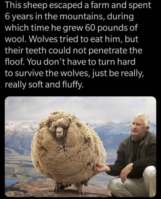 This sheep escaped a farm and spent 6 years in the mountains, during which time he grew 60 pounds of wool. Wolves tried to eat him but their teeth could not penetrate the floor. You don't have to turn hard to survive the wolves just be really really soft and fluffy.