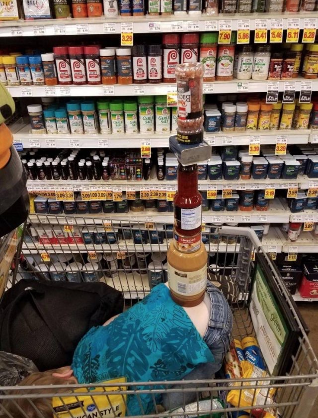 This is definitely a balanced diet but it looks a little dangerous. Those bottles could hit him in the head.