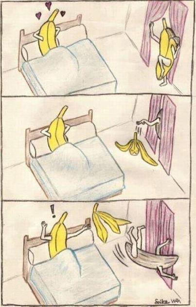 Looks like these bananas are ready for some fun! The woman banana just took off her peel. Here she comes! Whoops! Banana peel.