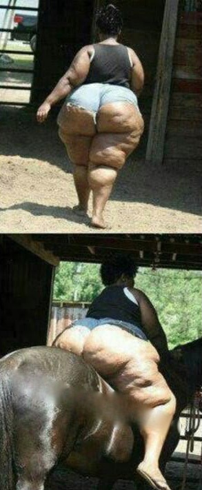 This woman should be careful about riding the animals. She may just hurt one of them seriously! That is some serious rear bottom heaviness. Then again maybe the horse likes the extra cushioning?