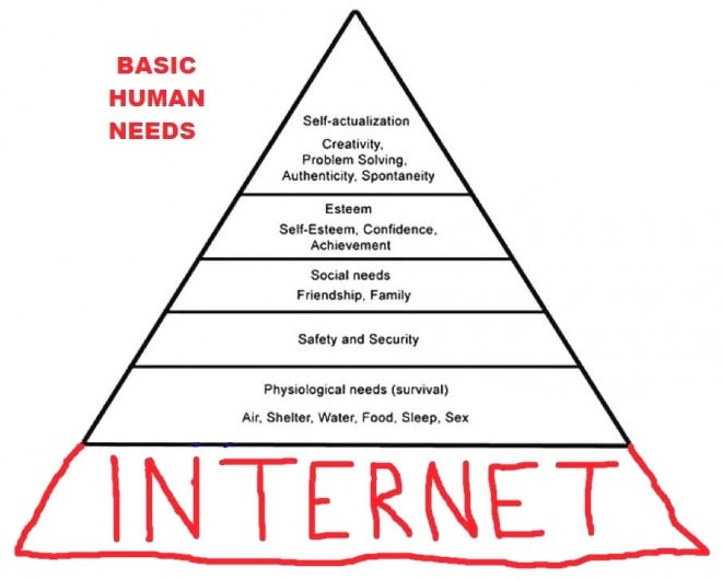 Self Actualization: Creativity, Problem Solving, Authenticity, Spontaneity. Esteem: Self Esteem, Confidence, Achievement. Social Needs: Friendship, Family. Safety and Security. Physiological needs (survival): Air, Shelter, Water, Food, Sleep, Sex. Base of the pyramid: INTERNET