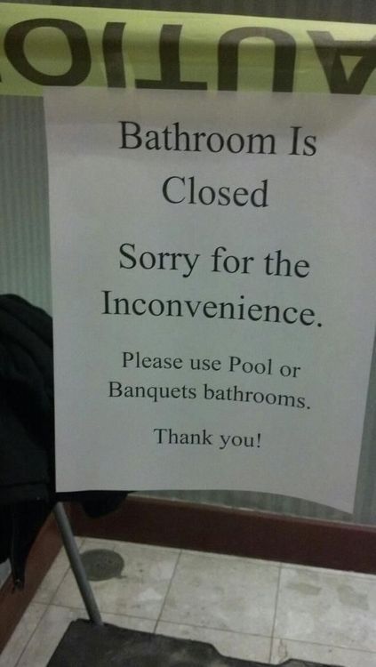 Bathroom Is Closed Sorry for the Inconvenience Please use the POOL or Banquets bathrooms! Thank you! I thought we said no peeing in the pool? ;-)