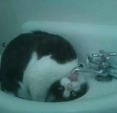 These cat is very talented. It looks like he's defying gravity to get a drink of water. Now somebody needs to turn it on full blast.