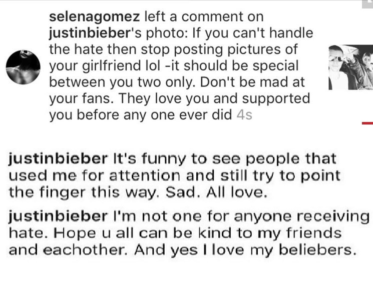 "If you can't handle the hate, then stop posting pictures of your girlfriend lol," Gomez commented on one of his pics of her. "It should be special between you two only. Don't be mad at your fans. They love you."