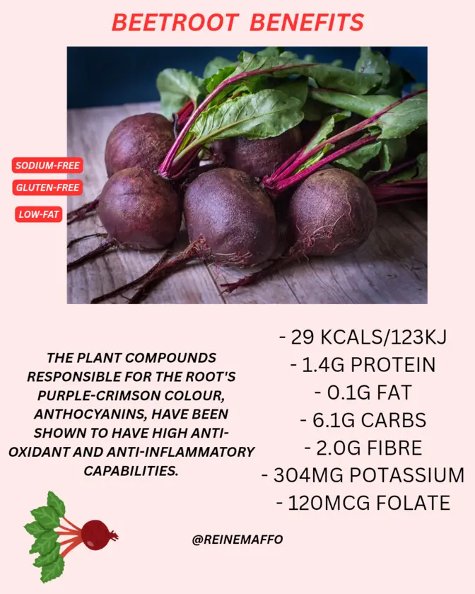 Lower blood pressure: Beets contain nitrates, which the body converts to nitric oxide, helping to relax and widen blood vessels and lower blood pressure.