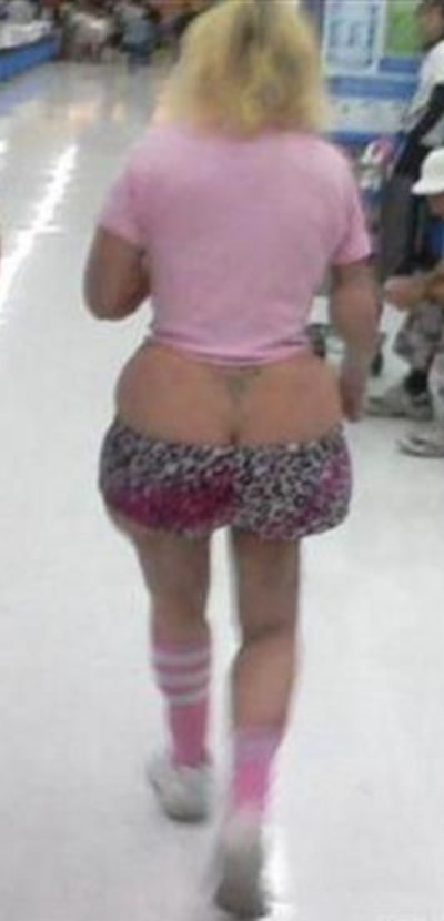 I don't if she's wearing shorts are a mini skirt but that is one weird shape on her. The tattoo is like icing on the cake. Epic fashion fail.