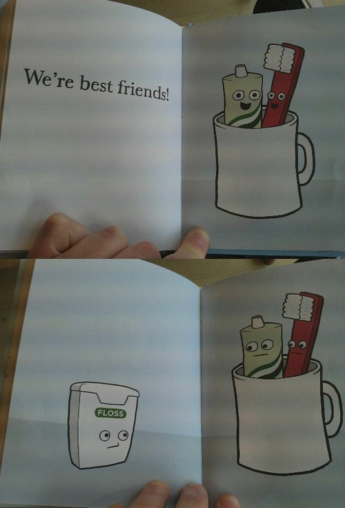 This is so sad. We all know that toothpaste and the toothbrush go together. Poor floss doesn't have friends. He feels so out of place.