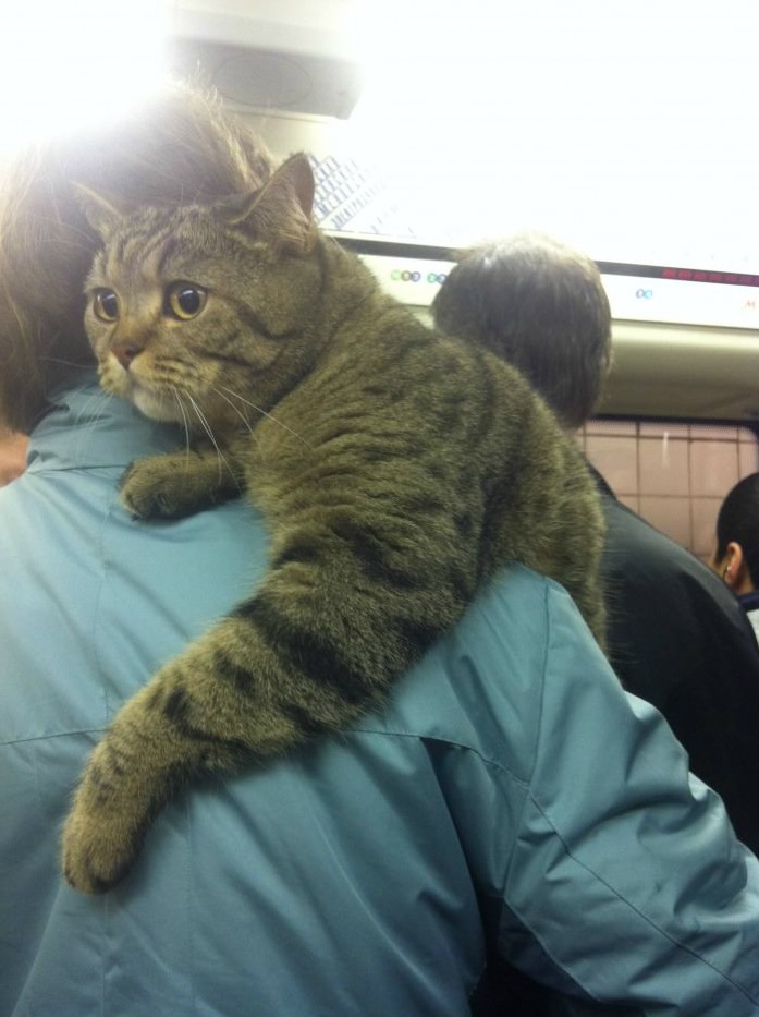 This kitty cat looks a bit worried as his owner carries him on the subway