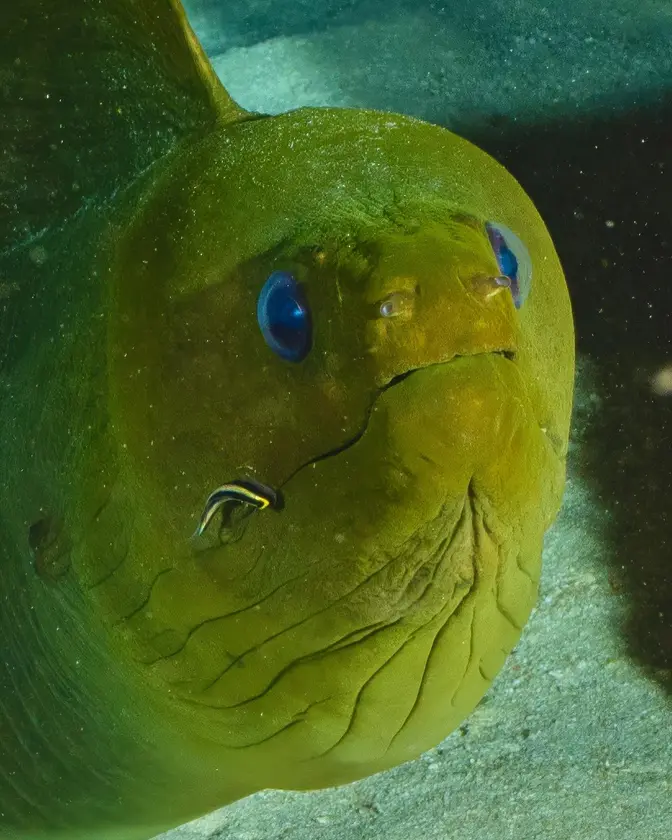 Big Green Moray Eel w/Tiny Fish Removing Parasites - Grand Cayman