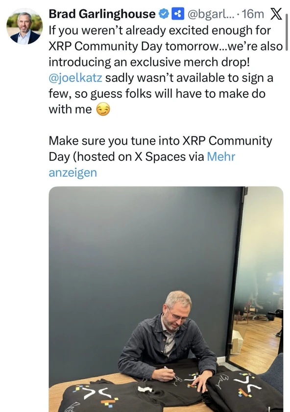 🚨 BIG NEWS: RIPPLE CEO BRAD GARLINGHOUSE ANNOUNCED THAT TOMORROW, ON #XRP COMMUNITY DAY, THERE WILL BE AN EXCLUSIVE MERCH DROP! 👕