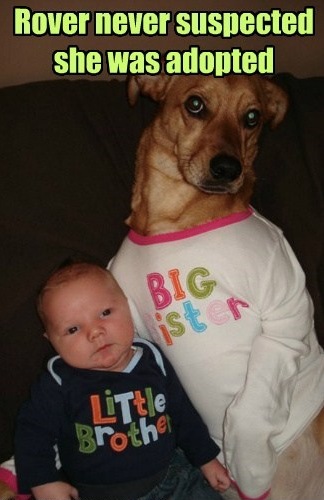 This is a great family photo. The dog and her little brother. You can see the dog has no idea the boy was adopted. In fact he has no idea they are taking a picture either.